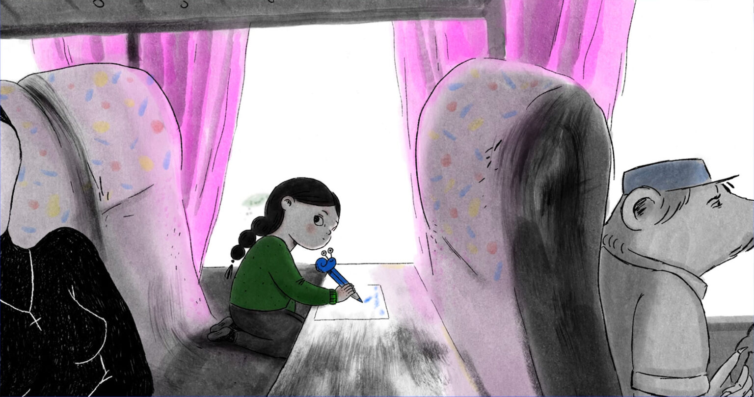 Agatha, une petite fille de 9 ans, voyage seule à bord d’un bus qui l’emmène vers un pays lointain. Angoissée par ce périple vers l’inconnu, elle écrit une lettre à sa copine mais son crayon tombe et se perd dans le bus. Obligée de surmonter sa timidité, Agatha se faufile entre les sièges à la recherche de l’objet, plongeant dans un univers fantastique, peuplé d’étranges passagers, mi-humain mi-animaux. A leur contact, Agatha découvre la vulnérabilité des adultes solitaires, arrachés à leur quotidien et leurs familles, mais caressant enfin leur rêve de départ… Et si finalement, c’était de ça qu’elle avait si peur ?