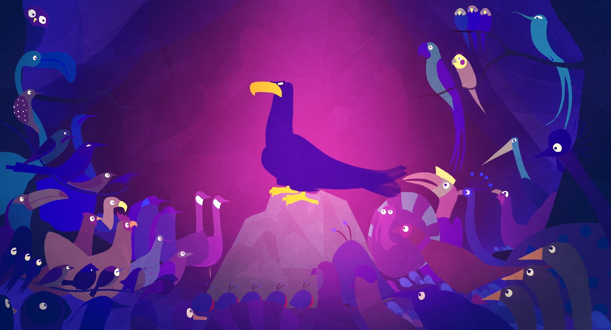Le Monde des oiseaux se réunit pour choisir son souverain. L’aigle royal se présente sur le trône. Il ne voit pas d’autre membre de leur communauté qui serait digne d’y prétendre. Personne n’ose en effet s’opposer au fier et puissant animal. Sauf… le roitelet. De sa petite voix, audacieux, il s’y propose aussi. L’aigle accepte son pari : celui des deux qui volera le plus haut dans le ciel portera la couronne…