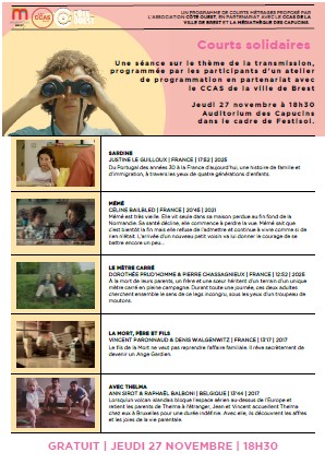 Quelle fierté nous avons de montrer une seconde fois le programme Courts Solidaires au Festival des Solidarités de la ville de Brest ! Après une séance qui a fait salle comble au dernier Festival européen du film court de Brest, venez redécouvrir la programmation de courts métrages créée lors de l’atelier Courts Solidaires sur le thème de la transmission au Festival des Solidarités, jeudi 27 novembre à 18h30 à la Médiathèque des Capucins.